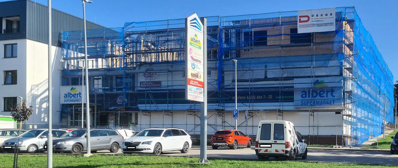 Rekonstrukce a nástavba třípodlažní budovy postavené 80. letech. Ve druhém patře vznikly nové obchodní prostory 280m² a ve třetím 11 nových bytů na ploše 1123m².