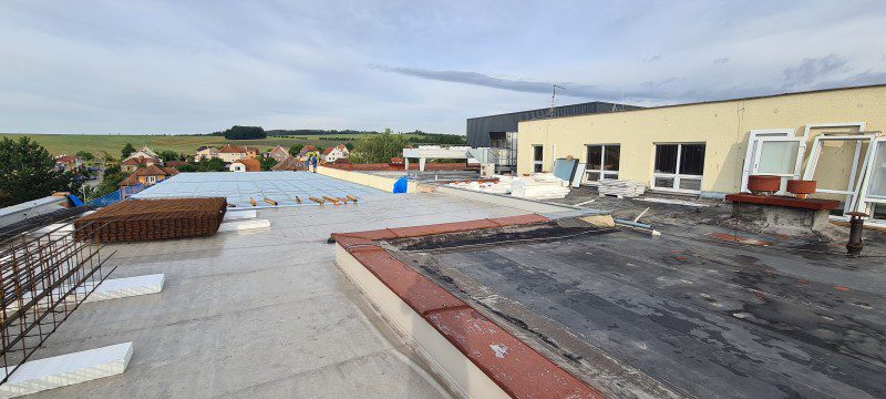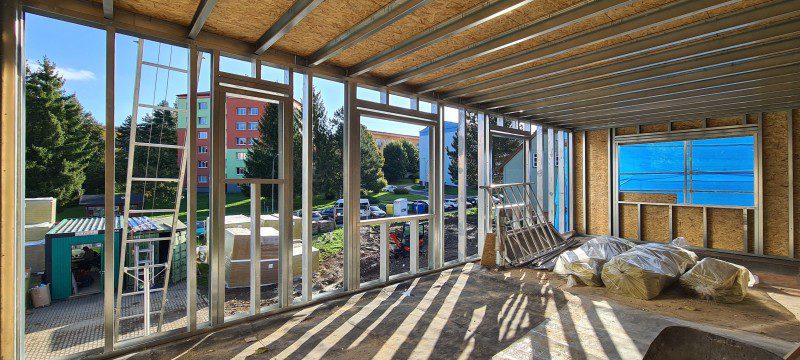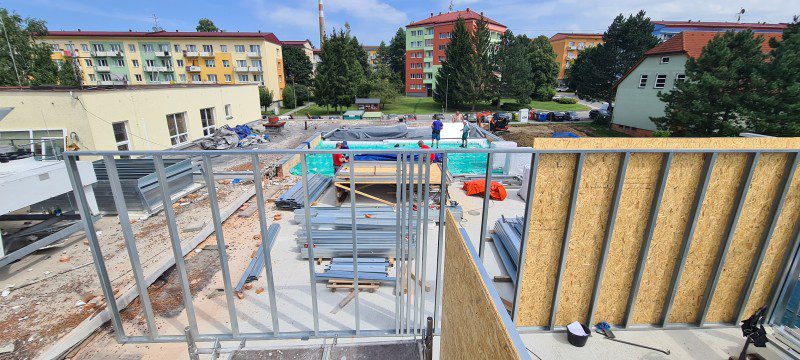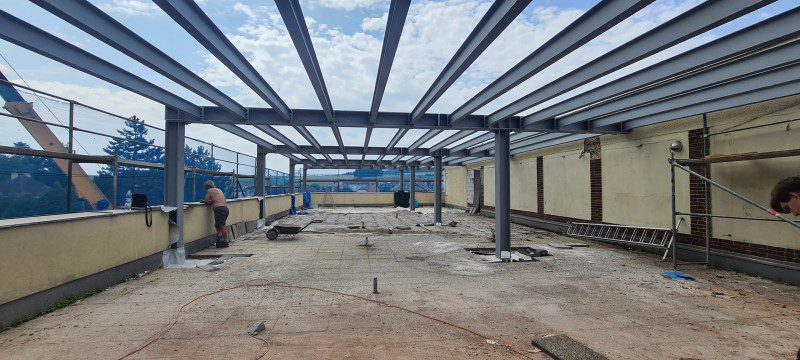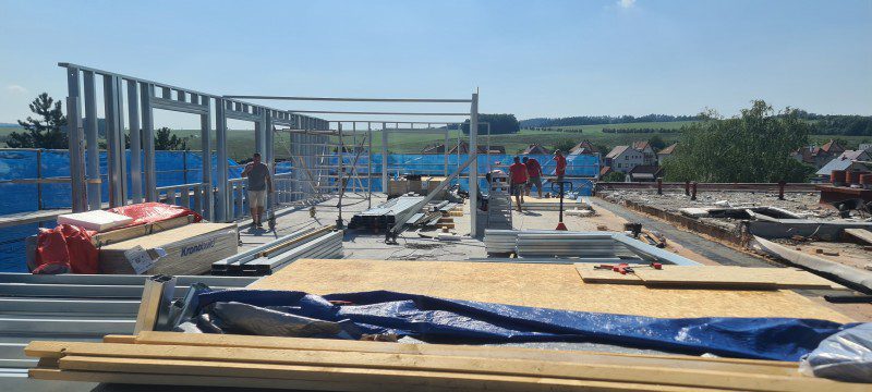 3.NP z důvodu zatížení budovy byla navržena tenkostěnná ocelová konstrukce, která splňuje statické kritéria. Sestavení jednotlivých segmentů bylo přímo na stavbě.