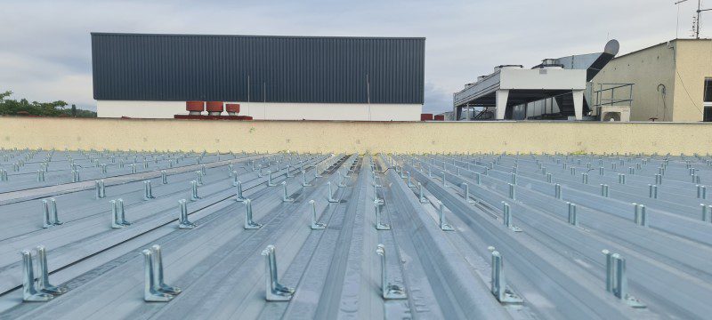 Stropní konstrukce: TR plech T 50/264/1055/0,8 mm; opatřena spřahovacími kotvami X-HVB 110, výztuž, beton