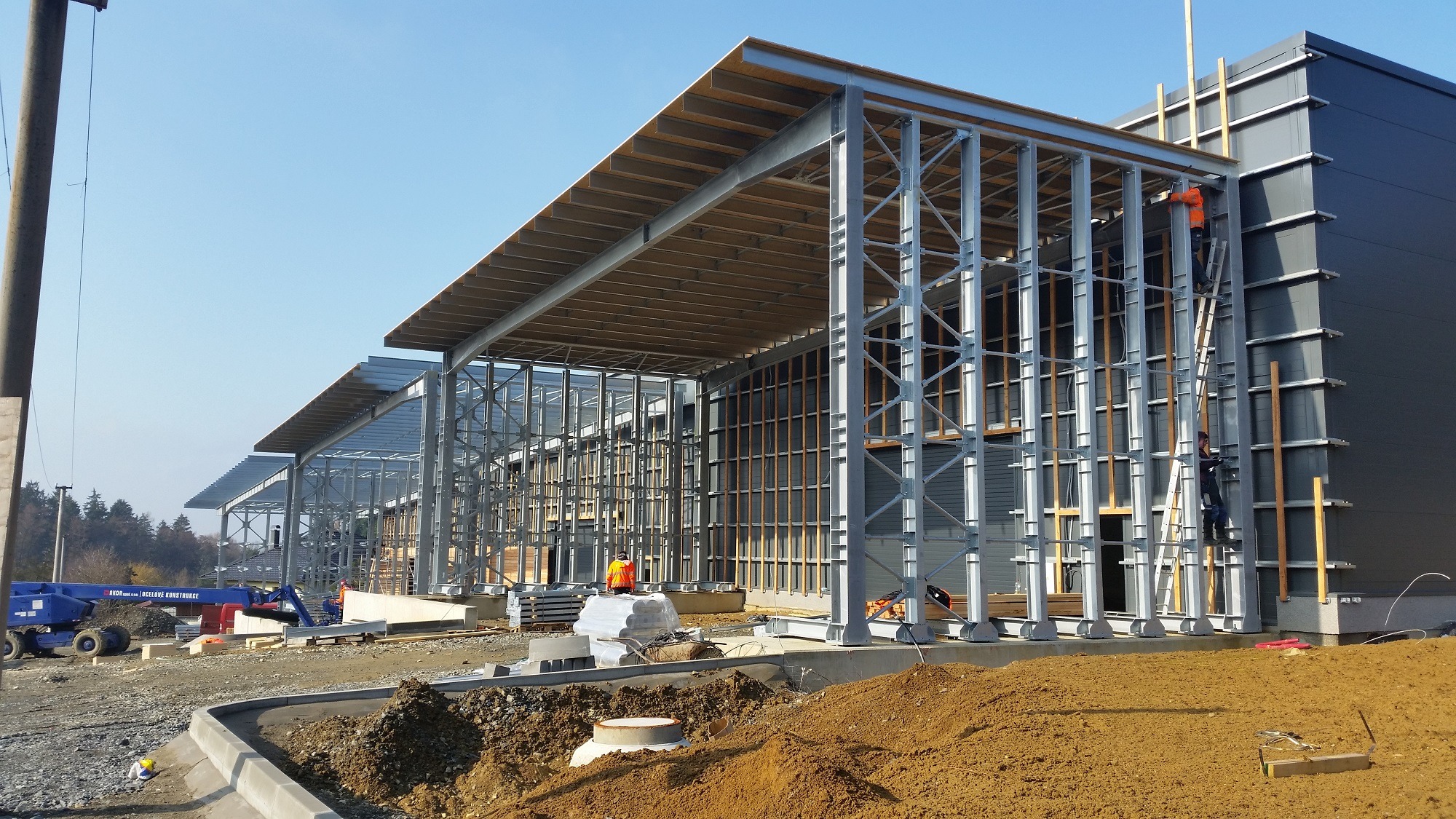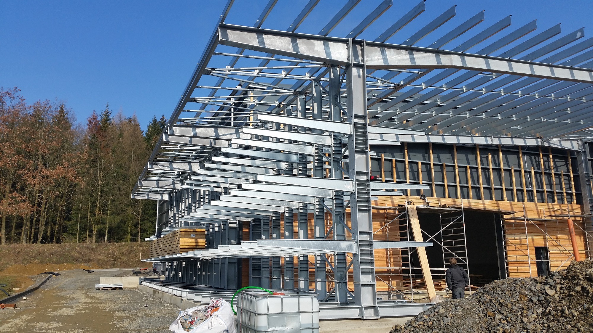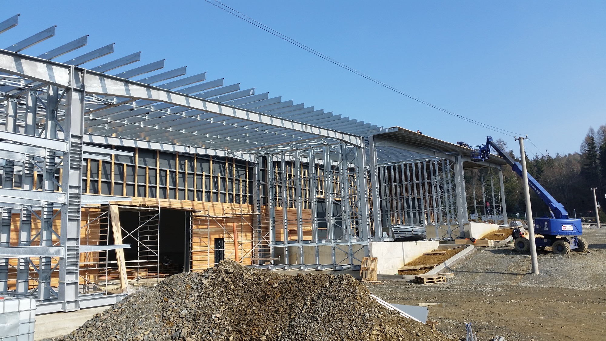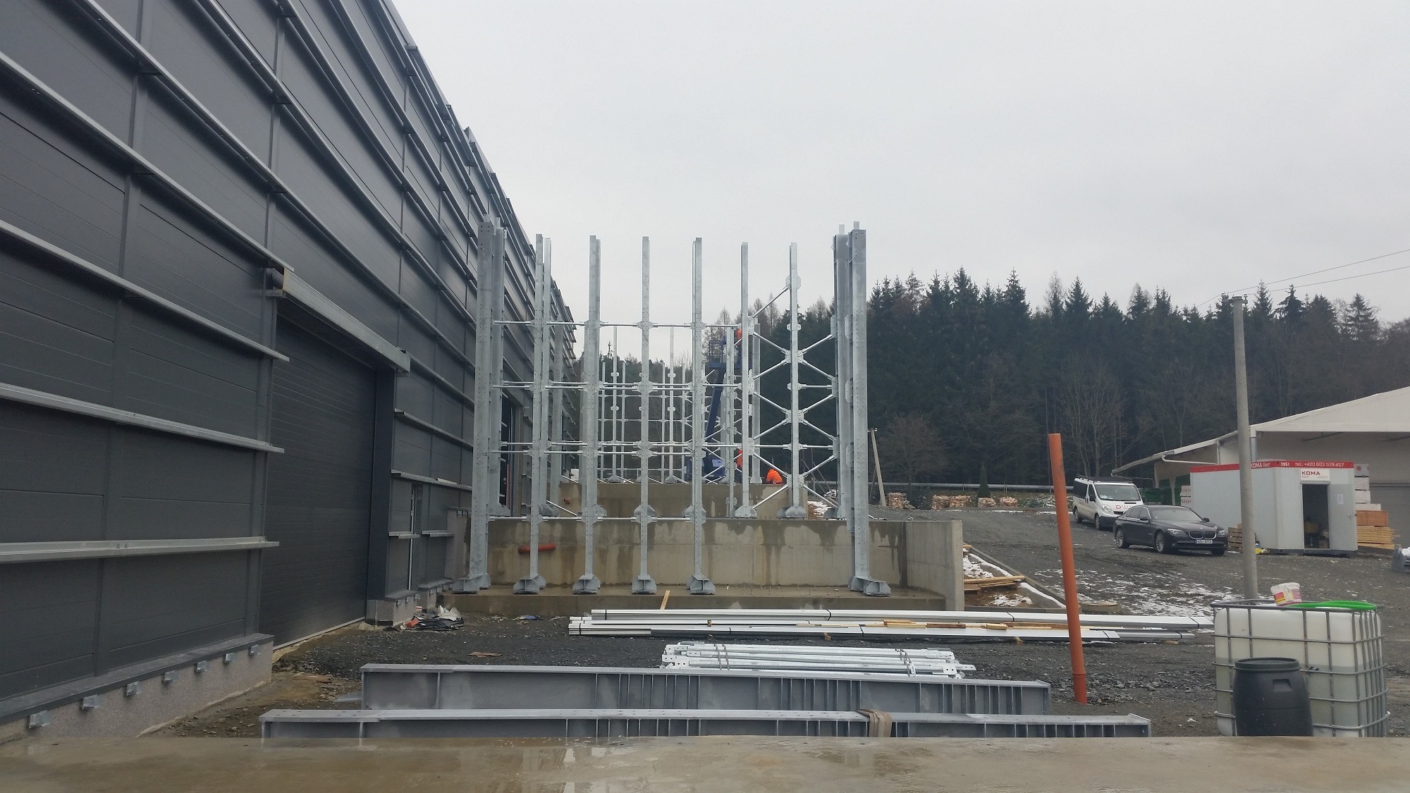 Důvěru investora jsme získali na základě našich referencí. Bylo nutné vyladit stávající návrh ocelové konstrukce. Výsledná konstrukce pro zakladače, která je v pozinkové úpravě vypadá elegantně a efektivně. Z naší strany se jednalo o projektovou dokumentaci, výrobu a montáž ocelové konstrukce, včetně střešního pláště, který tvoří OSB desky a FATRAFOL. Celkem tedy čtyři přístřešky se sedmi řadami zakladačů.